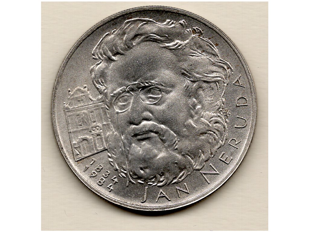 Pamětní mince o nominální hodnotě 100 Kčs byla vydána roku 1984 u příležitosti 150. výročí narození spisovatele. Averz nese realisticky pojatý portrét doplněný architektonickým motivem Prahy, která byla s Nerudovým životem i tvorbou úzce spjata. Kompozice propojuje osobnost autora s prostředím, jež jej inspirovalo.