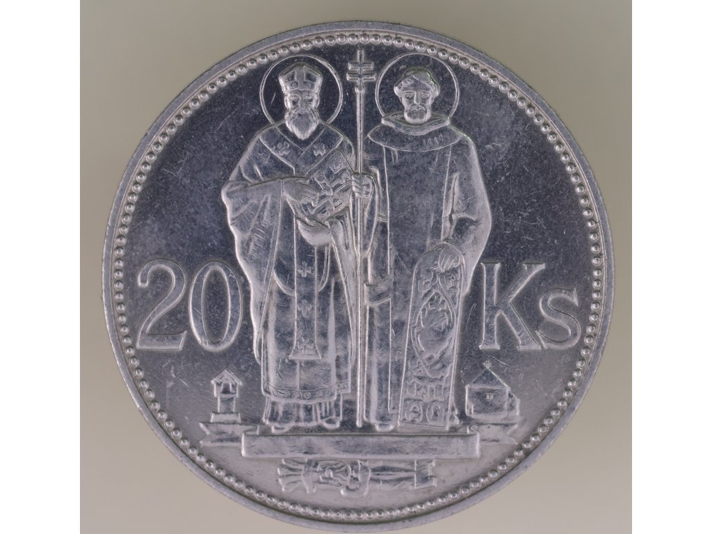 Slovenská republika vydala roku 1941 stříbrnou minci v nominální hodnotě 20 korún k připomenutí významu svatých Cyrila a Metoděje, soluňských bratří, kteří v 9. století přinesli na Velkou Moravu písmo, liturgii i kulturní tradici slovanského křesťanství. Jejich odkaz byl pro válečné Slovensko symbolem duchovní kontinuity a legitimity národní státnosti.