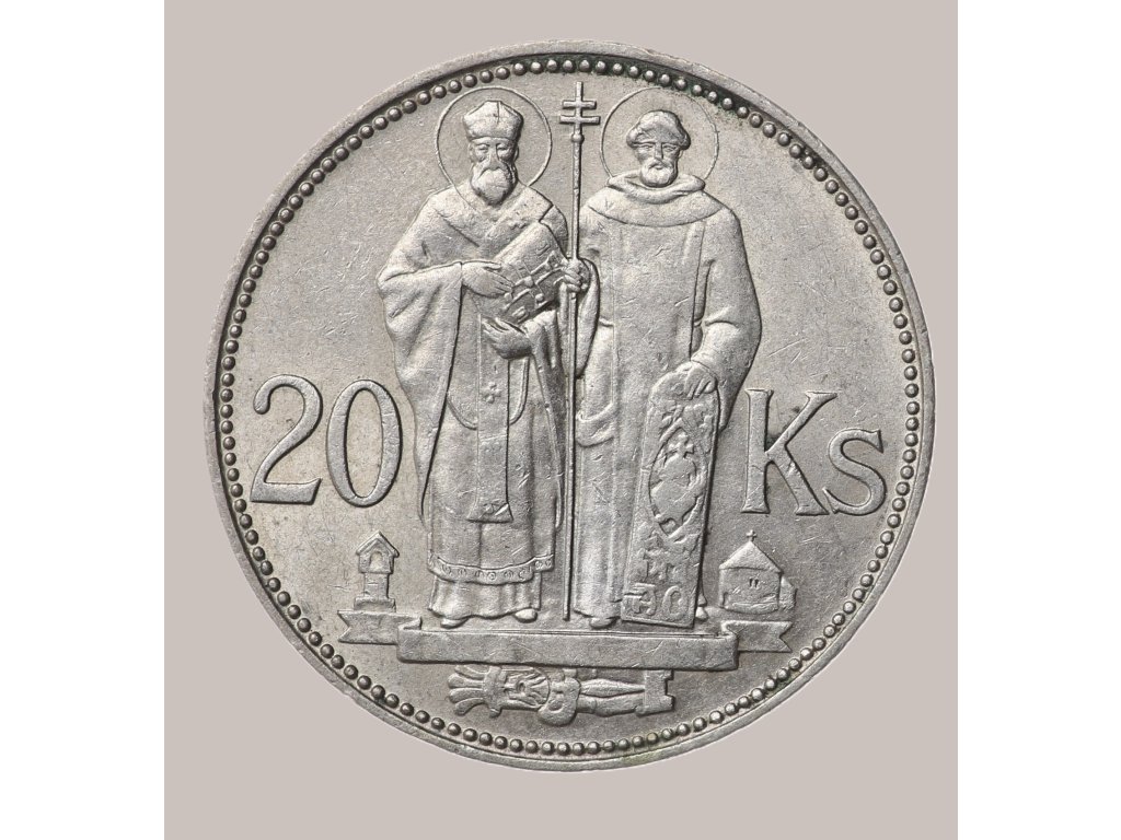 Slovenská republika vydala roku 1941 stříbrnou minci v nominální hodnotě 20 korún k připomenutí významu svatých Cyrila a Metoděje, soluňských bratří, kteří v 9. století přinesli na Velkou Moravu písmo, liturgii i kulturní tradici slovanského křesťanství. Jejich odkaz byl pro válečné Slovensko symbolem duchovní kontinuity a legitimity národní státnosti.