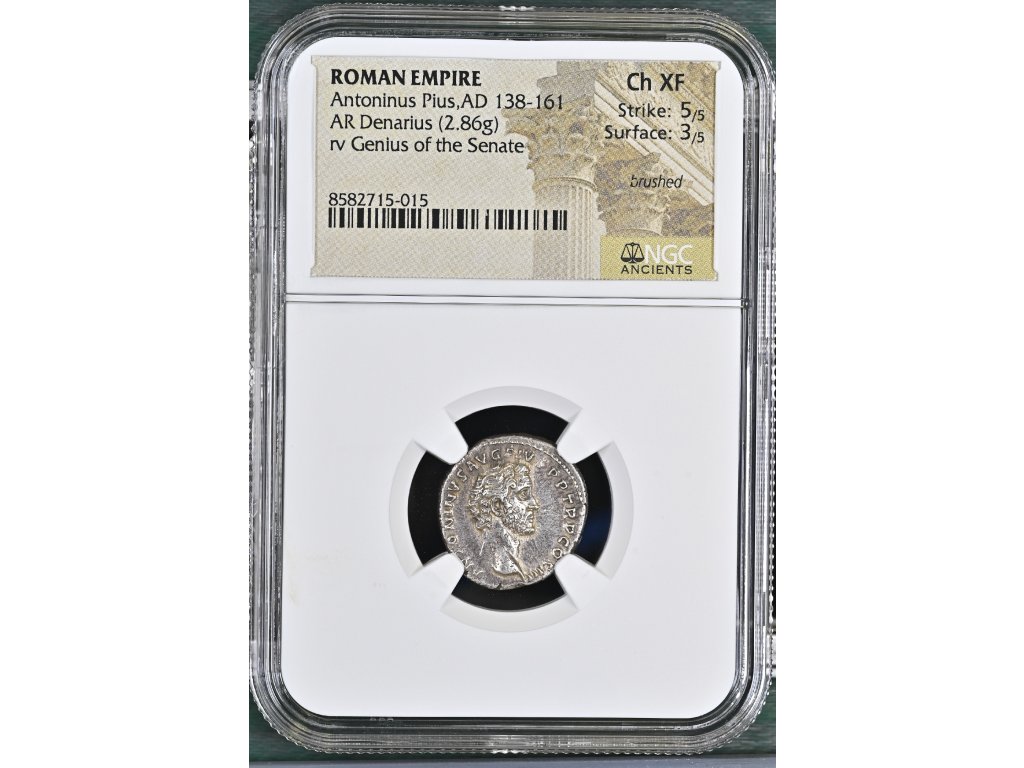 Denáry Antonina Pia jsou ceněny pro svou kvalitní ražbu a klidný, klasický styl portrétu, typický pro polovinu 2. století. Tento exemplář z římské mincovny je dochován ve velmi pěkném stavu, potvrzeném certifikací Ch XF, která zaručuje zachovalé detaily, dobrý úder a autentický povrch. Pro sběratele představuje atraktivní spojení historického významu, estetické kvality a ověřené autenticity.
