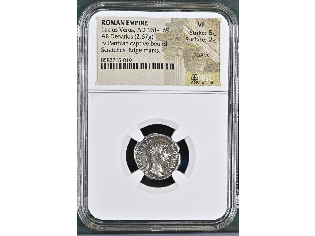 Lucius Verus, spoluvladař Marka Aurelia, vládl v letech 161–169 n. l. a proslul především svými vojenskými úspěchy ve válce proti Parthům. I když skutečné velení armády zajišťovali jeho generálové, oficiální vítězství byla připsána jemu, čímž byla posílena jeho autorita i postavení v říši. Denár z roku 165 n. l. patří k nejvýznamnějším ražbám této éry a sloužil k oslavě triumfu nad východními protivníky.