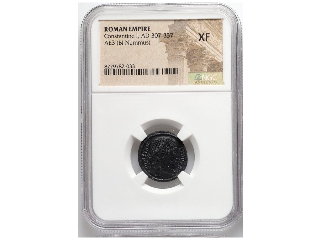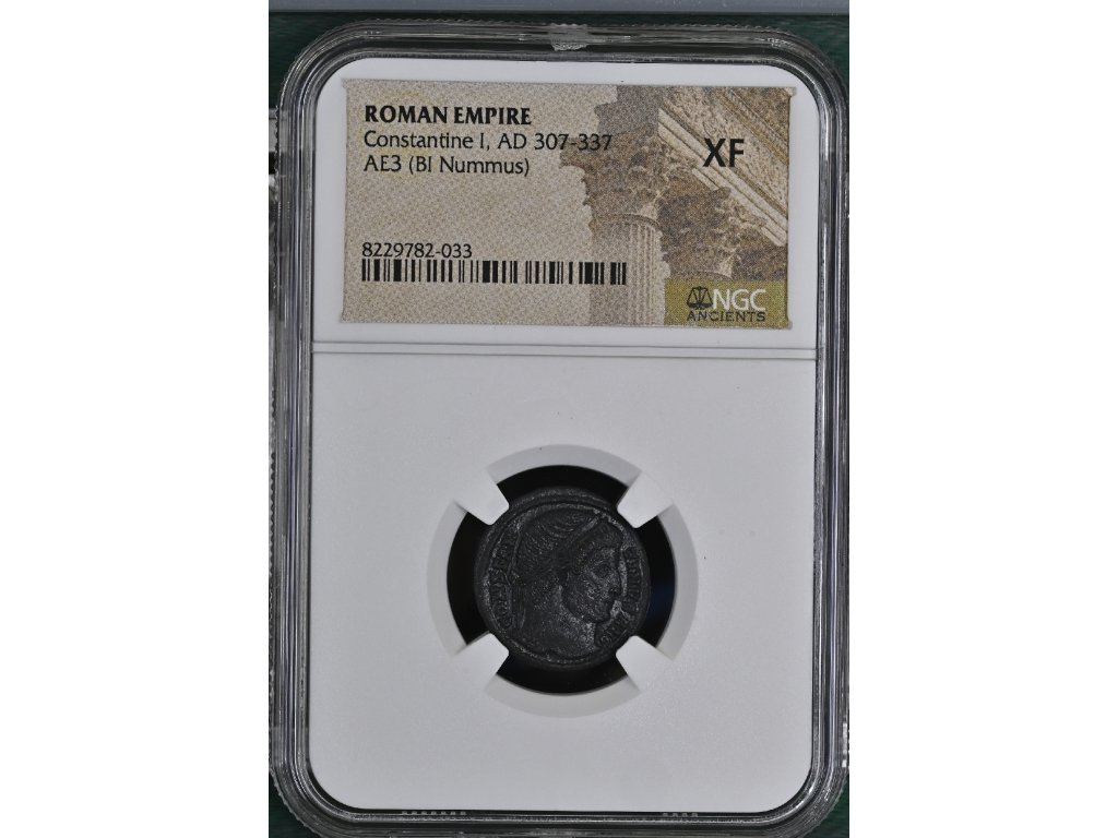 Tento bronzový AE3 nummus představuje typickou drobnou oběžnou minci konstantinovského období. Portrétní zobrazení císaře zdůrazňuje jeho autoritu a legitimitu, zatímco reverzní kompozice, ohraničená věncem, odpovídá dobové symbolice stability, obnovy a kontinuity římské moci. Emise tohoto typu vznikaly v době rozsáhlých měnových reforem, které měly stabilizovat hospodářství po krizích 3. století.