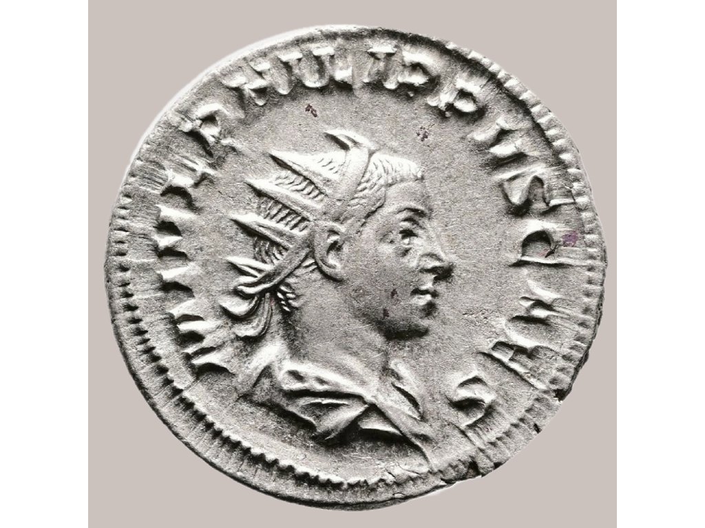 Tento stříbrný antoninián byl vyražen v Římě mezi lety 244–246 n. l. a představuje mladého Filipa II., syna císaře Filipa Araba, který tehdy nesl titul caesara – tedy následníka trůnu. Mincovní motiv PRINCIPI IVVENT („princi mládeže“) navazuje na římskou tradici, kdy mladí muži z císařského rodu byli oficiálně uznáváni za vůdce římské mládeže, především v kontextu vojenské služby a státní výchovy.