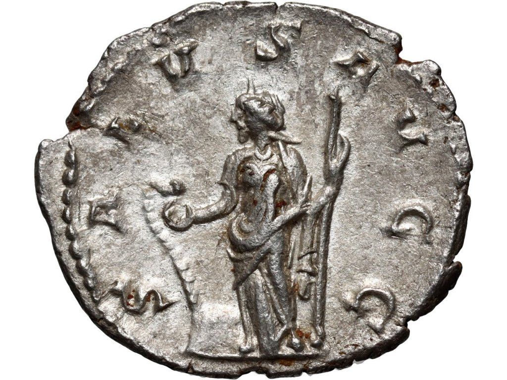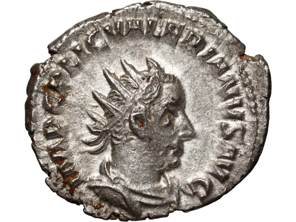 Tento stříbrný antoninian byl ražen v letech 255–266 n. l. za vlády císaře Valeriána I., který se zapsal do historie jako první římský císař zajatý cizím vládcem. Averz mince nese portrét Valeriána s radiální korunou a legendou IMP C P LIC VALERIANVS AVG, zdůrazňující jeho císařskou důstojnost a božské postavení. Reverz zobrazuje bohyni, držící roh hojnosti (cornucopia) a žezlo, symbol plodnosti, prosperity a ochrany impéria, čímž odráží propagandu stabilního a silného státu i v čase krize.