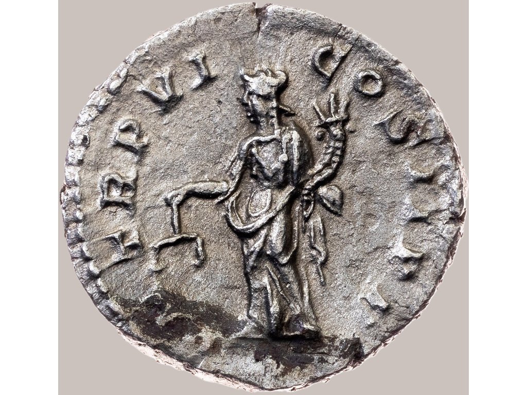 Mince ražené za jeho panování vynikají jemnou portrétní rytinou a vyváženou symbolikou. Na averzu je císař vyobrazen s věncem na hlavě a s klidným, idealizovaným výrazem – symbolem moudrosti a umírněnosti. Reverz tradičně nese postavu bohyně či alegorické postavy, která v tomto typu ztělesňuje Felicitas, symbol štěstí a prosperity impéria. Tento motiv měl podtrhovat poselství míru a hojnosti, které mělo kontrastovat s napjatou politickou realitou říše.