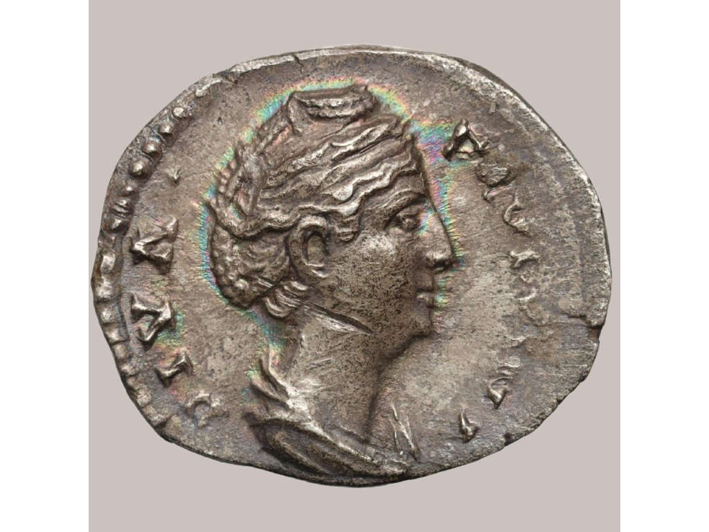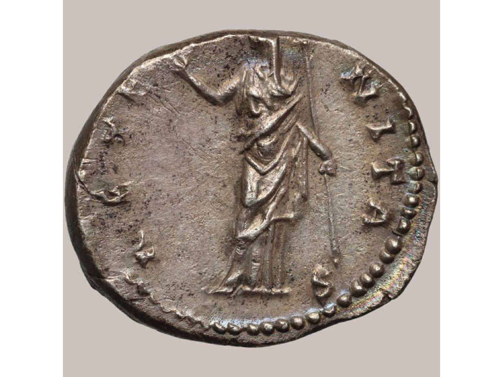 Tento vzácný stříbrný denár byl ražen v Římě roku 150 n. l. na počest Faustiny Starší, manželky císaře Antonina Pia a tety Marka Aurelia. Averz zobrazuje idealizovaný portrét Faustiny obrácený vpravo, s legendou DIVA FAVSTINA, která ji oslavuje jako božskou. Reverz představuje bohyni Juno, držící žezlo a otočenou vlevo, s legendou AETERNITAS, symbolizující věčnost a nesmrtelnost. Tento motiv odkazuje na tradiční římský kult divinizovaných císařů a císařoven, zdůrazňující stabilitu dynastie a úctu k zemřelým. Mince o hmotnosti 3,37 g a průměru 19 mm se vyznačuje vysokým reliéfem a jemným leskem, který doplňuje duhová patina. I přes drobný řez na krku zůstává zachovalost XF+/XF výjimečná a činí z tohoto denáru atraktivní sběratelský kus. Denáry Faustiny Starší jsou mezi sběrateli ceněny nejen pro svou estetiku, ale také pro silné historické a dynastické souvislosti Římské říše.