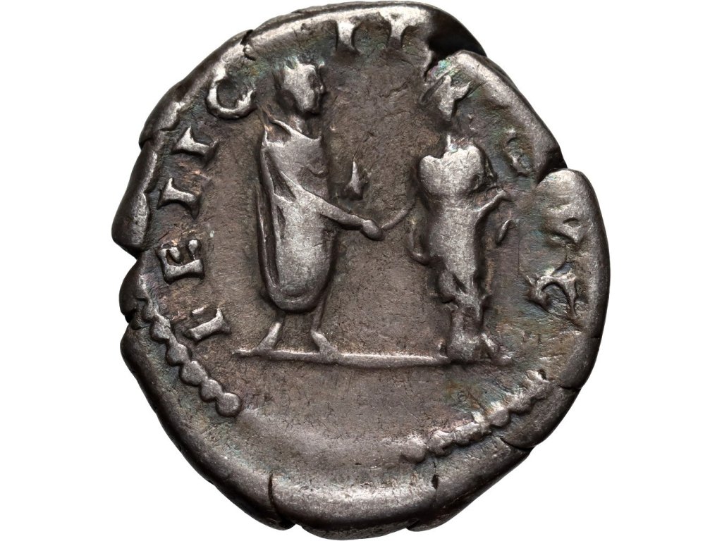 Tento stříbrný denár byl ražen v roce 134 n. l. za vlády císaře Hadriána, který je znám jako panovník míru a stabilizace hranic římské říše. Averz mince nese portrét Hadriána ve vavřínovém věnci s legendou HADRIANVS AVG COS III PP, připomínající jeho třetí konzulát a titul otce vlasti. Reverz zdobí postava Felicity, zosobnění štěstí a blahobytu, která drží caduceus a podává pravici císaři – motiv zdůrazňuje harmonii a prosperitu impéria.