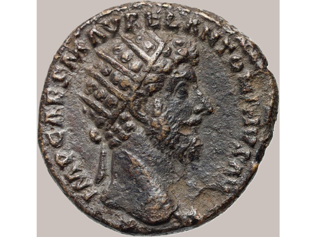 Portrét Marka Aurelia s typickou radiální korunou symbolizuje jeho autoritu a přináležitost k božskému slunci, zatímco titulatura IMP CAES M AVREL ANTONINVS AVG P M dokládá jeho plné přijetí císařské moci. Tento typ mincí je ceněn nejen pro svůj historický význam, ale i pro filozofický rozměr vlády tohoto „filozofa na trůnu“, který se snažil vládnout podle zásad stoicismu.