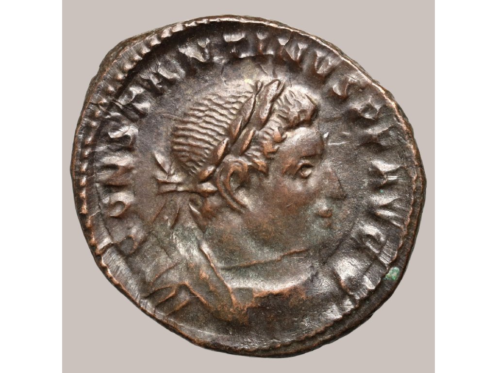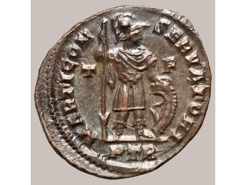 Tento velký bronzový follis byl ražen mezi lety 310–313 n. l. v mincovně Trevír (Augusta Treverorum), tehdejším významném vojenském a správním centru římské říše. Averz nese energický portrét Konstantina Velikého ve vojenské zbroji a s vavřínovým věncem, s legendou CONSTANTINVS P F AVG, zdůrazňující jeho vojenskou zdatnost a zbožnost. Reverz zobrazuje boha války Marta ve zbroji, držícího kopí a štít, symbolizující ochranu a vítězství císaře. Okrajová legenda MARTI CONSERVATORI vyzdvihuje Marta jako ochránce císařovy moci a říše. V poli se nachází písmena T-F a v exergu značka mincovny PTR, potvrzující ražbu v Trevíru. Mince váží 4,36 g a má průměr 24 mm. Díky kvalitě XF/XF+ se pyšní ostrými detaily, zejména na postavě Marta a portrétu císaře, což z ní činí velmi atraktivní sběratelský kus. Tento exemplář dokonale vystihuje propagandistickou funkci mincí v době upevňování moci Konstantina I., jednoho z nejvlivnějších panovníků pozdního císařství.