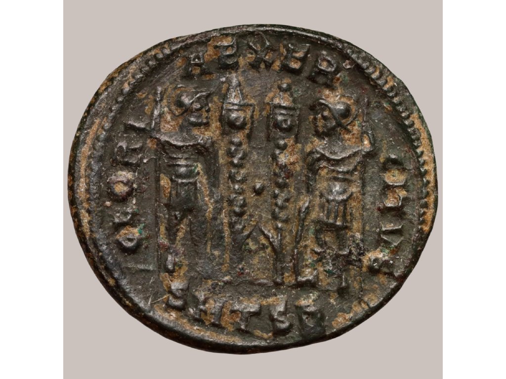 Tento bronzový follis byl ražen v letech 317–337 n. l. za vlády Konstantina II., syna slavného Konstantina Velikého. Averz nese portrét mladého císaře ve zbroji a s vavřínovým věncem, doplněný legendou CONSTANTINVS IVN NOB C, zdůrazňující jeho postavení jako mladého Augusta. Reverz zobrazuje dva legionáře stojící proti sobě a mezi nimi dva vojenské prapory, s legendou GLORIA EXERCITVS (sláva armádě), vyzdvihující sílu a jednotu římských legií. Ve spodní části je značka mincovny SMTSB, označující Thessaloniku.