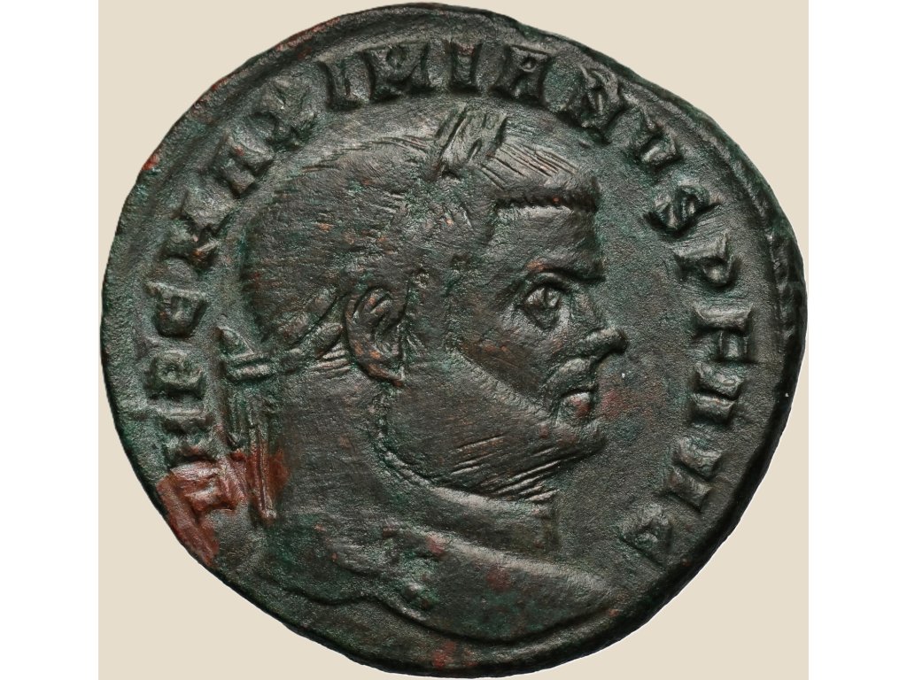 Follis byl zaveden v rámci rozsáhlé měnové reformy kolem roku 294, jejímž cílem bylo obnovit důvěru v říšskou měnu. Ražby z let 300–301, mezi něž patří i tento exemplář z římské mincovny, nesou důraznou propagandistickou symboliku. Averz s vavřínem ověnčeným portrétem císaře a legendou IMP C MAXIMIANVS P F AVG vyjadřuje jeho legitimitu a autoritu.