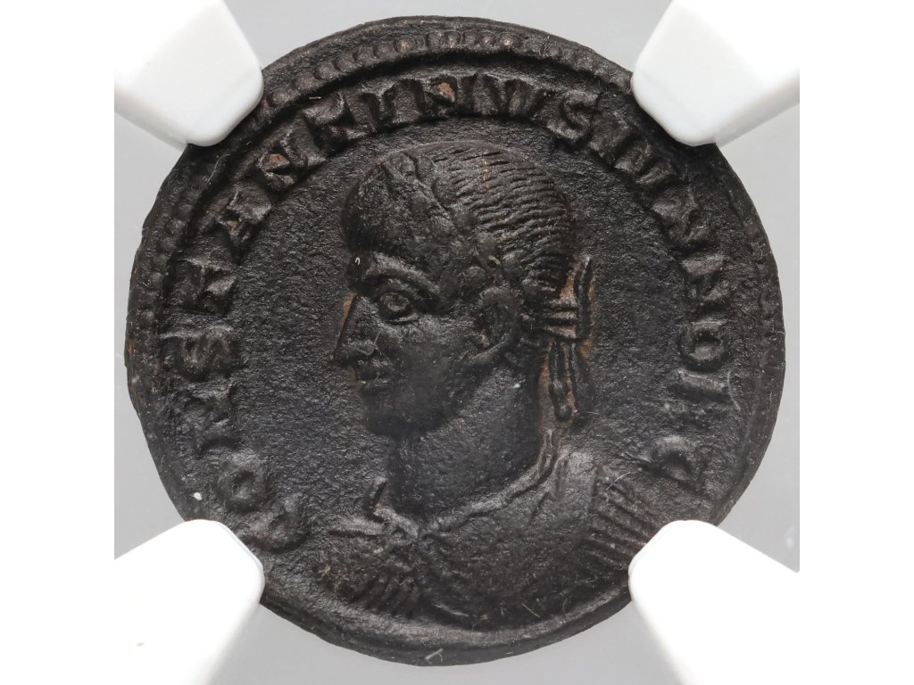 Mince je certifikována společností NGC Ancients s hodnocením XF, což potvrzuje velmi pěkný stav dochování s dobře čitelnými detaily portrétu i votivního věnce. Atraktivní varianta s poprsím vlevo patří mezi méně běžné typy a představuje zajímavý sběratelský kus z období konstantinovské dynastie.
