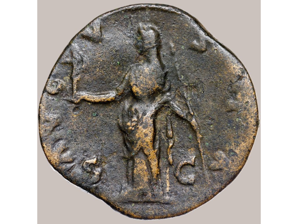 Faustina starší, manželka císaře Antonina Pia, patřila k nejuctívanějším ženám římské historie. Po její smrti v roce 140 n. l. ji senát prohlásil za bohyni – Diva Faustina – a její kult se stal významnou součástí oficiálního náboženství. Císař nechal na její počest vystavět chrám na Foru Romanu a razil řadu pamětních mincí, mezi nimi i tento bronzový sestercius. Na averzu nese mince portrét zbožštěné Faustiny s nápisem DIVA FAVSTINA, zatímco reverz zobrazuje bohyni Vestu, ochránkyni domácího krbu a státu, s palladiem a žezlem – symboly moci a věrnosti Římu.