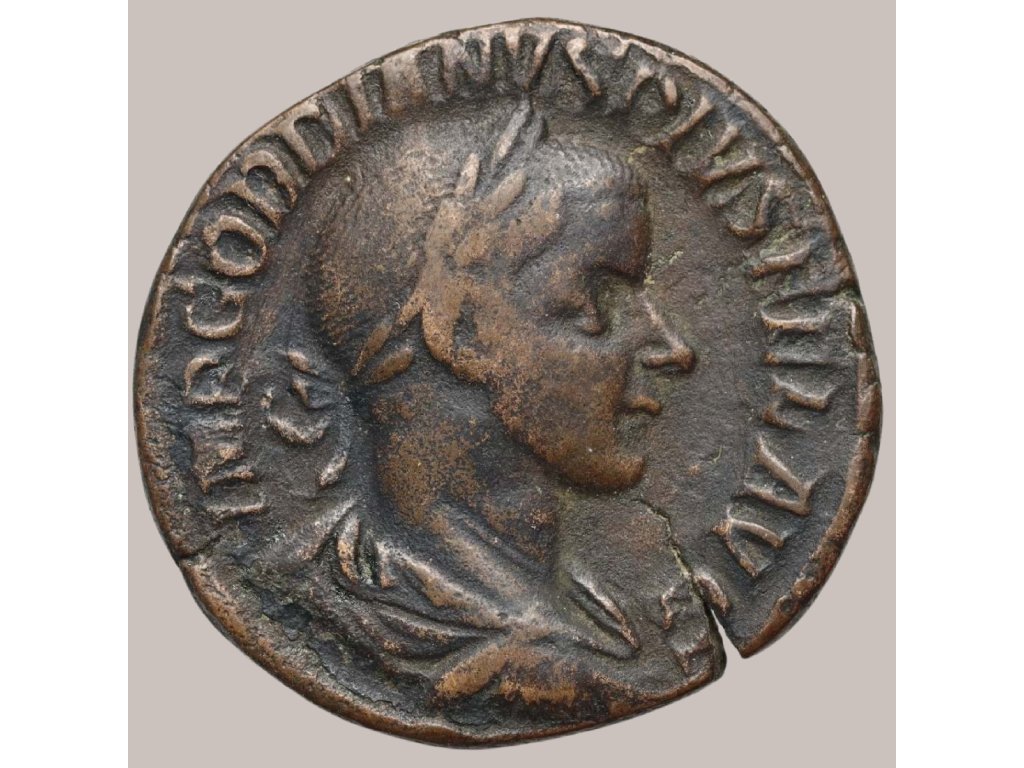 Tento sestercius byl ražen za vlády mladého císaře Gordiana III., který nastoupil na trůn jako chlapec a vládl v období složité politické situace. Averz zobrazuje jeho portrét s vavřínovým věncem vpravo, doplněný legendou IMP GORDIANVS PIVS FEL AVG, která vyzdvihuje jeho ctnosti a legitimitu. Reverz zobrazuje boha Slunce (Sol) stojícího čelně s hlavou vlevo, v pravé ruce zdvihá ruku na pozdrav a v levé drží glóbus — symbol světové moci a věčnosti. V poli mince se nachází označení S-C, potvrzující souhlas senátu s ražbou, a v okraji legenda AETERNITATI AVG, odkazující na věčnost impéria. Tento exemplář má hmotnost 17,68 g a průměr 30 mm. Zachovalost VF+ podtrhuje dobře dochované detaily a krásnou hnědou patinu. Mince je ražena centrálně na pravidelném disku, což zvyšuje její atraktivitu. Pokud je mince certifikována (např. NGC), potvrzuje to její pravost a podporuje hodnotu v rámci sbírek.