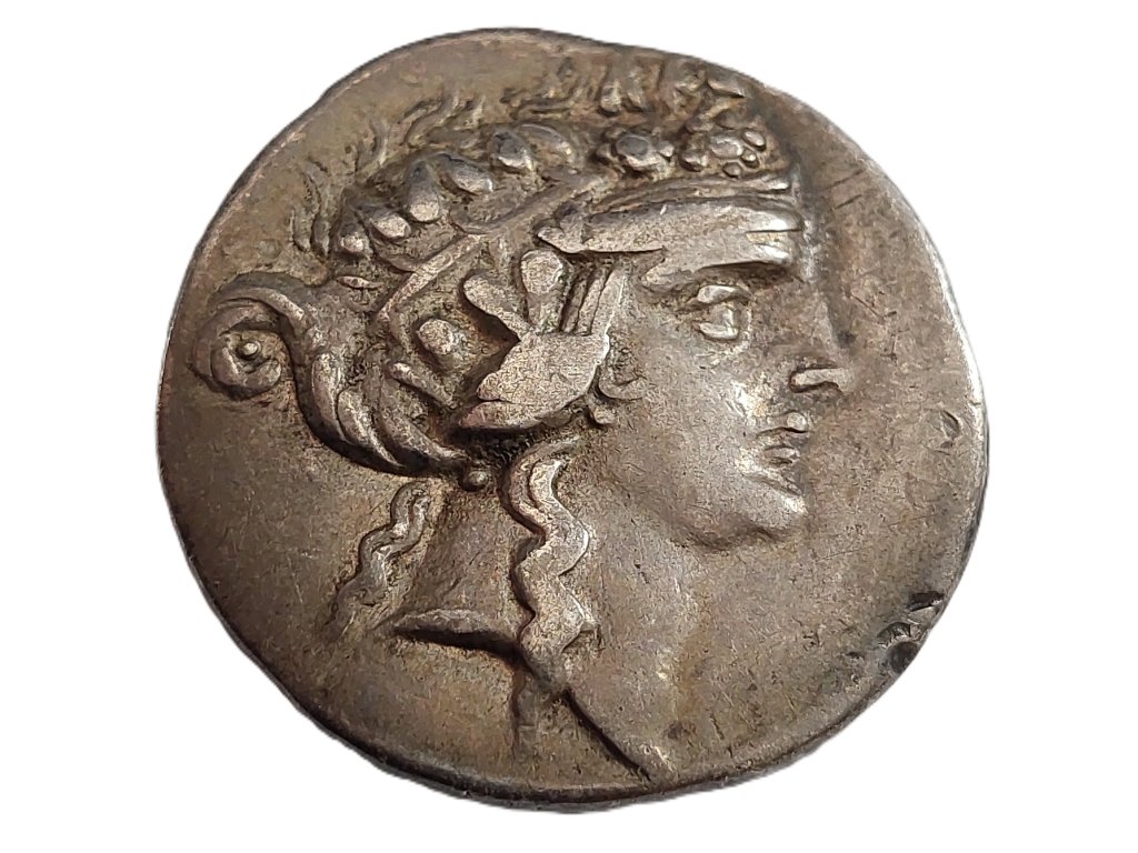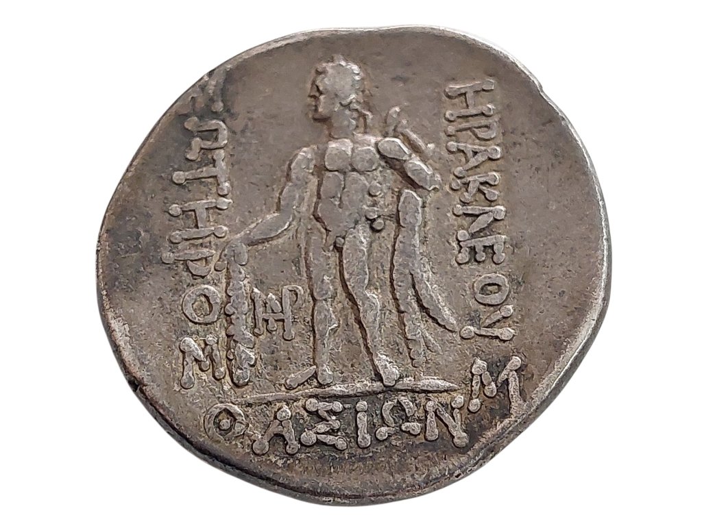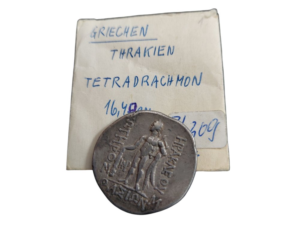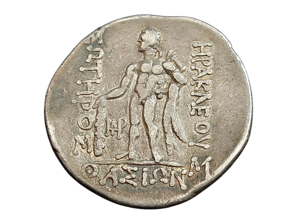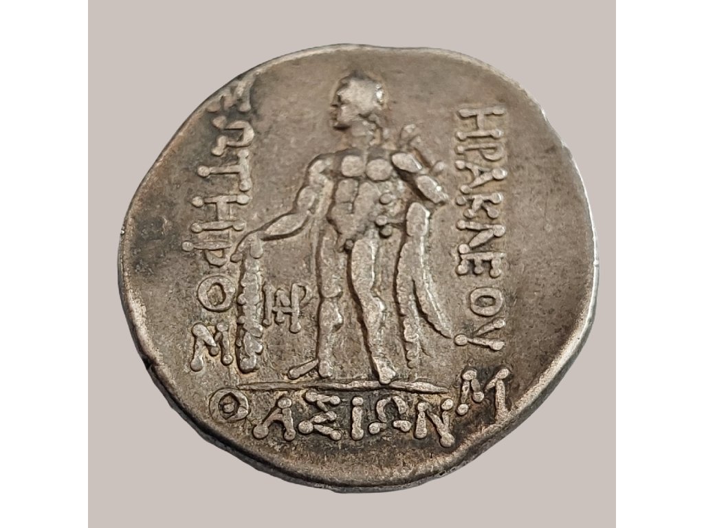 Stříbrná tetradrachma z oblasti Thrákie zobrazuje Herakla v plné síle – stojící postava s kyjem a lví kůží symbolizuje nejen hrdinství, ale i ochranu měst a jejich obyvatel. Nápis ΗΡΑΚΛΕΟΥ ΣΩΤΗΡΟΣ (Heraklés Sótér – Herakles Spasitel) vyzdvihuje jeho roli jako božského ochránce a uctívané postavy ve východních částech řeckého světa. Averz mince pak zobrazuje bohyni nebo idealizovaného mladíka s věncem z vinné révy, což naznačuje spojení s Dionýsem nebo mytologickým hrdinou.