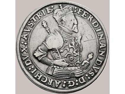 Stříbrný tolar Ferdinanda II. Tyrolského, ražený v Hallu kolem roku 1580. Vynikající ukázka habsburského mincovnictví s portrétem arcivévody v brnění a bohatě členěným rodovým...
