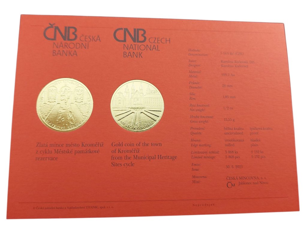 ČNB – 5000 Kč, Městská památková rezervace Kroměříž, 2023, zlatá mince Standard