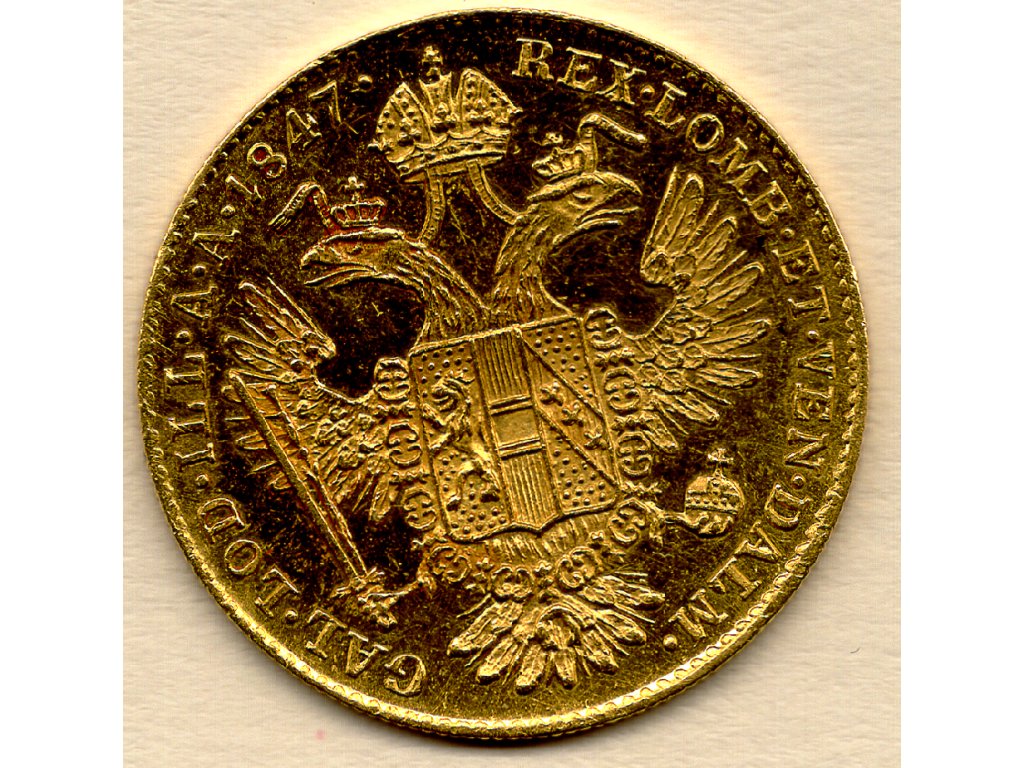 Mincovna ve Vídni byla v 19. století jedním z nejvýznamnějších evropských center výroby zlatých mincí. Dukáty Ferdinanda V. se vyznačují čistotou ryzího zlata (986/1000) a vynikající rytinou. Averz nese portrét císaře s vavřínovým věncem, symbolem moudrosti a císařské důstojnosti, doprovázený opisem s tituly panovníka. Reverz zobrazuje tradiční dvouhlavého orla s korunou a znakem habsburských držav, doplněný letopočtem 1847 a značkou mincovny „A“ pro Vídeň.