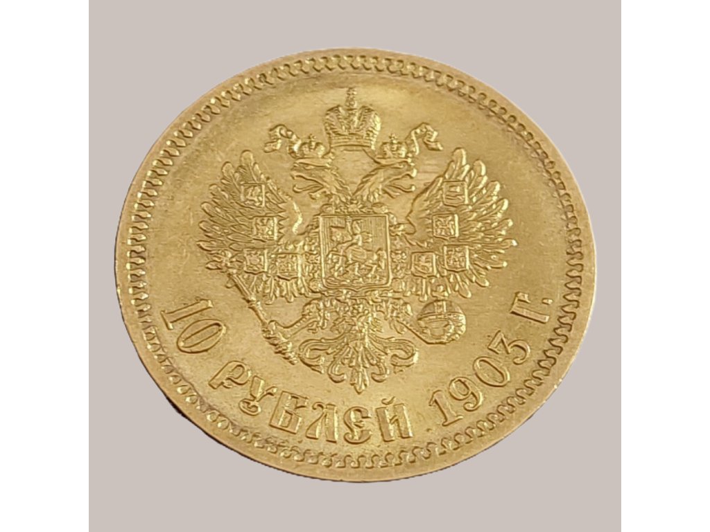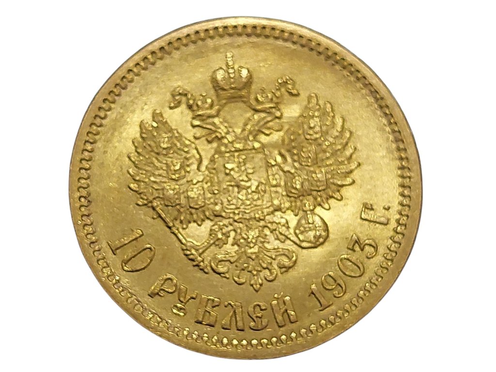 Mince o nominální hodnotě 10 rublů byla ražena v petrohradské mincovně a označena značkou AP, která odkazuje na mincmistra Apollona Grasgofa. Její ryzost činí 900/1000 a hmotnost 8,59 g, což ji činí oblíbeným sběratelským a investičním artiklem. Ročník 1903 patří navíc k těm, které uzavírají éru stabilní produkce před začátkem bouřlivých let.