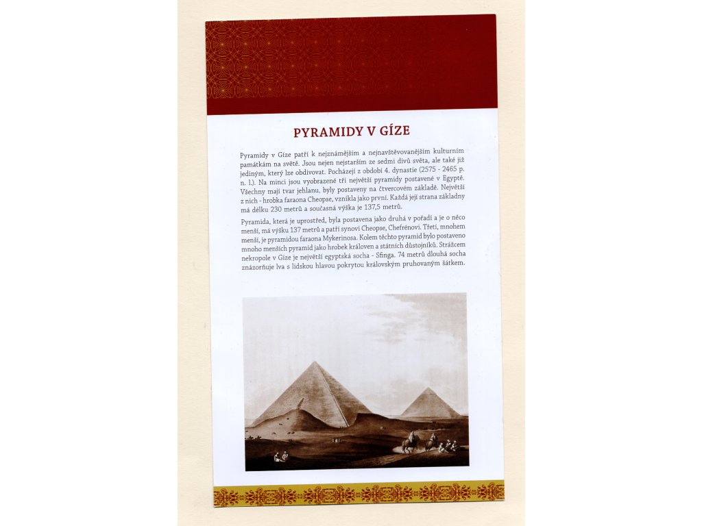 Reverz mince je věnován pyramidám v Gíze, ikonickému archeologickému komplexu, jenž vznikl ve 3. tisíciletí př. n. l. v období 4. dynastie starověkého Egypta. Největší z nich, Cheopsova pyramida, byla po staletí nejvyšší stavbou světa a dodnes fascinuje svou monumentálností, technickým řešením i symbolikou spojenou s posmrtným kultem faraonů.
